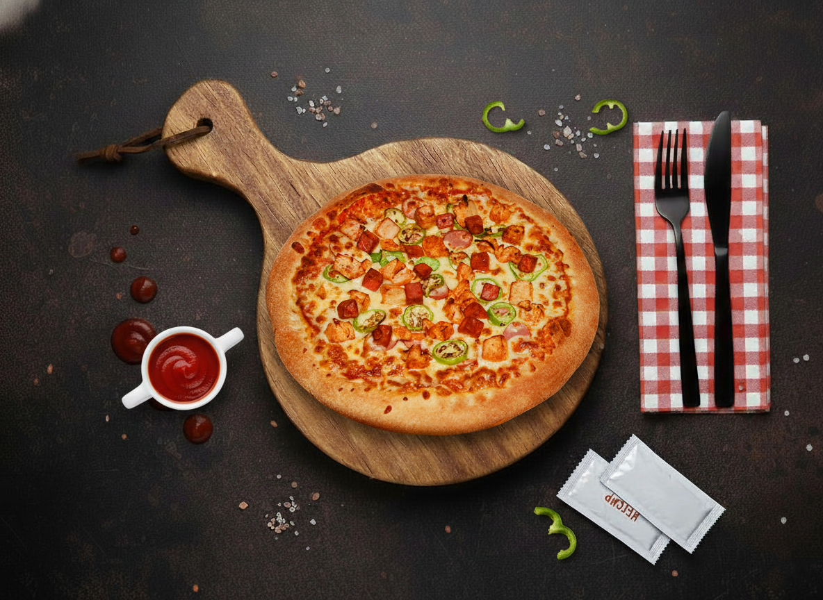 Samion’s American Hot Pizza is crispy baked base topped with zesty pizza sauce, melted cheese, and any three toppings of your choice, delivering bold, fiery flavors in every bite.