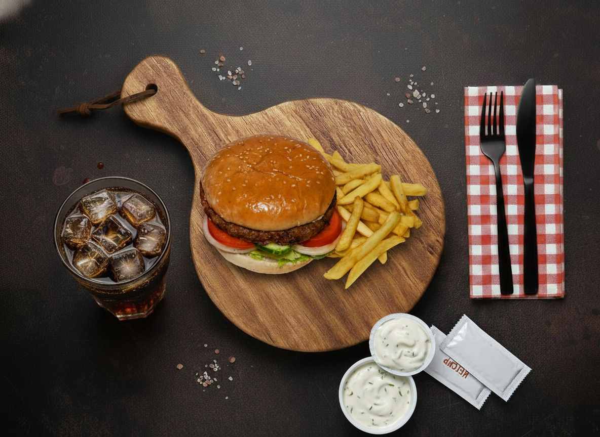 Samion’s Beef Burger features a perfectly cooked beef patty, served on a soft bun with fresh salad, tomatoes, onions, and lettuce. Each bite is packed with juicy, savory flavor, making it a classic favorite for any burger lover.