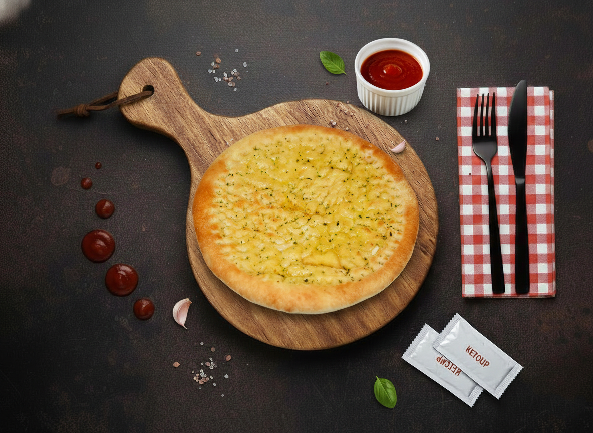 Samion’s Garlic Bread is available in Small 7 inch, Medium 9 inch, Large 12 inch, and Extra Large 16 inch sizes. It is topped with garlic butter, oregano, and can be customized with extra toppings like cheese, spicy chicken, tandoori chicken, pepperoni, onions, mushrooms, olives, and more.