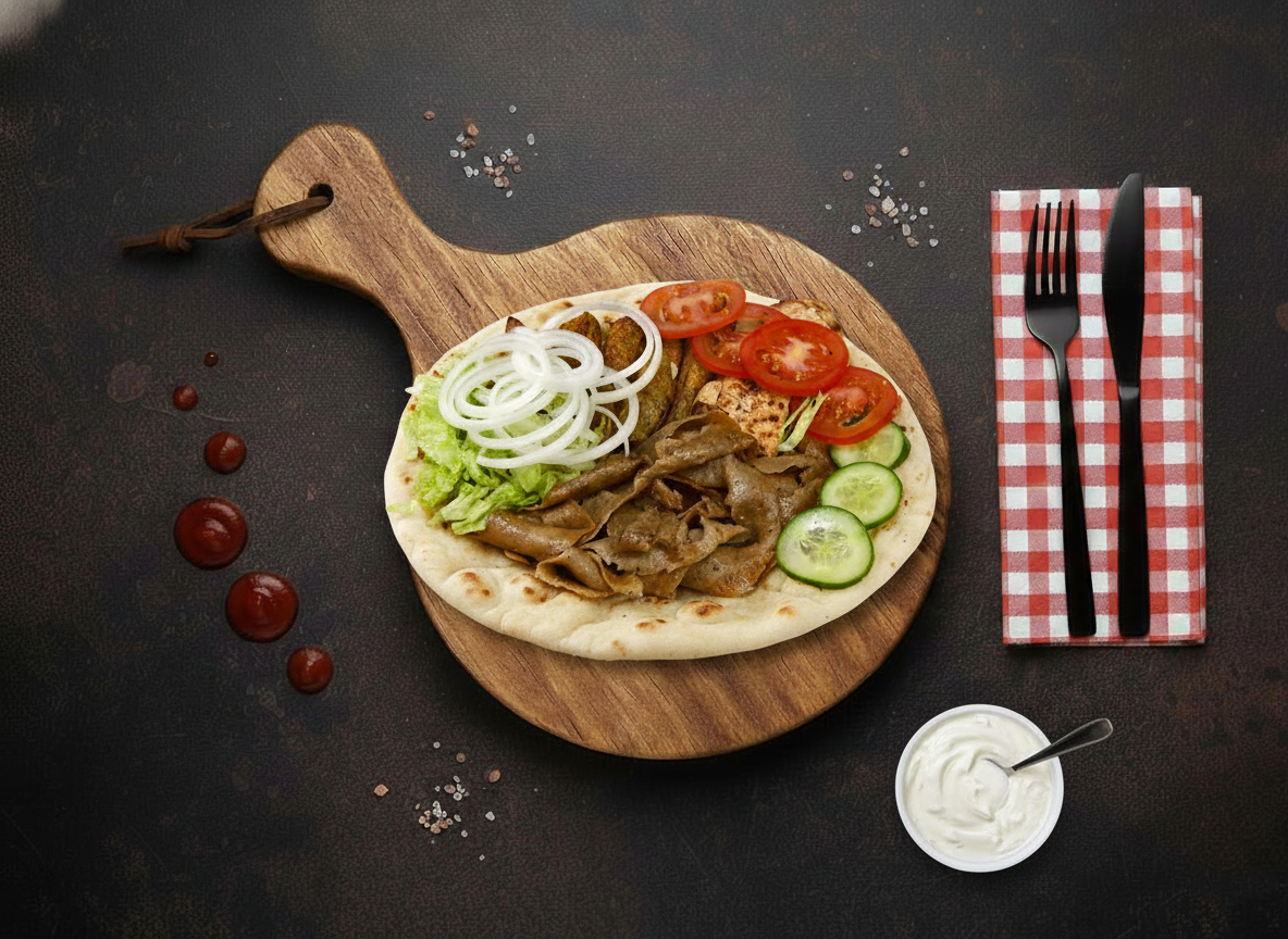 It can be topped with full salad, fresh tomato, cabbage, onion, cucumber, lettuce, mayo sauce, garlic sauce, tomato sauce, mint sauce, BBQ sauce, chili sauce, peri peri sauce, fried onions, fried mushrooms, and fried peppers. Available in Regular in Pitta or Large in Naan sizes.