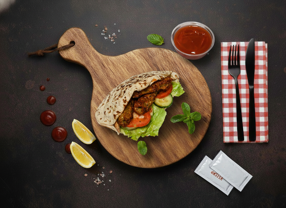 It can be topped with full salad, fresh tomato, cabbage, onion, cucumber, lettuce, mayo sauce, garlic sauce, tomato sauce, mint sauce, BBQ sauce, chili sauce, peri peri sauce, fried onions, fried mushrooms, and fried peppers. Available in Regular in Pitta or Large in Naan.