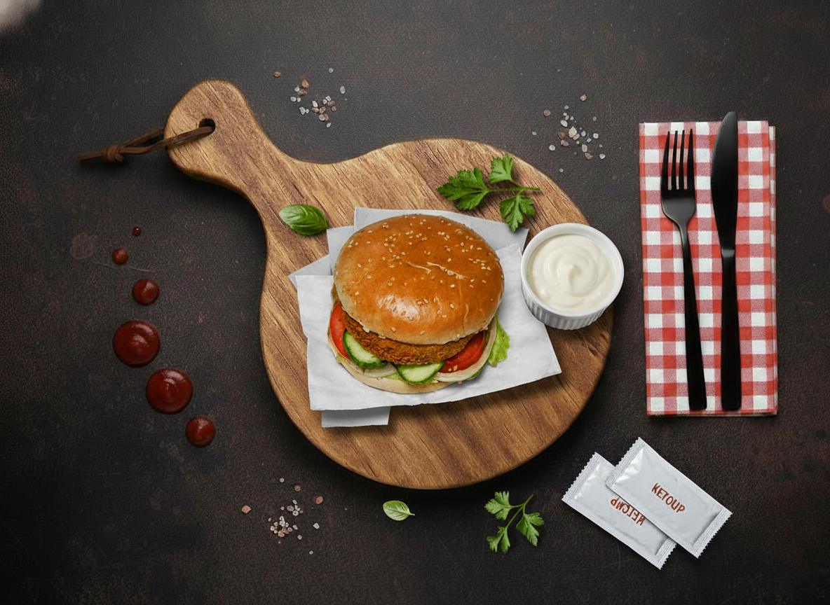 Samion’s Fish Burger features a golden, crispy fish fillet on a soft bun with fresh salad, tomato, and sauces. The combination of crispy exterior and tender fish inside makes it a perfect seafood burger choice.